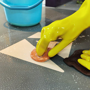 打蜡前要检查现场通风是否良好,地面是否已清洗干净、干燥,否则不得进行涂蜡。涂蜡要用专用蜡拖,采用∞涂蜡工艺,一般弹性橡胶地板涂蜡2-3遍。蜡水未干透前严禁上人走动,要做好隔离警示,保证涂蜡效果。