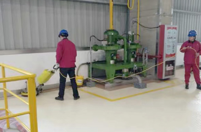 用洗地机配用红色磨垫、清洁剂、除油剂、除蜡水1:1:0.5:20兑水稀释后倒入洗地机水斗中,均匀研磨,除去地板表面保护蜡质、油脂、灰尘及其他污垢,采用吸水机将污水吸干;