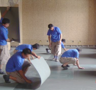 按照地形和设计要求进行下料预铺,预铺卷材时地板边部需重叠20~30mm,便于裁切
